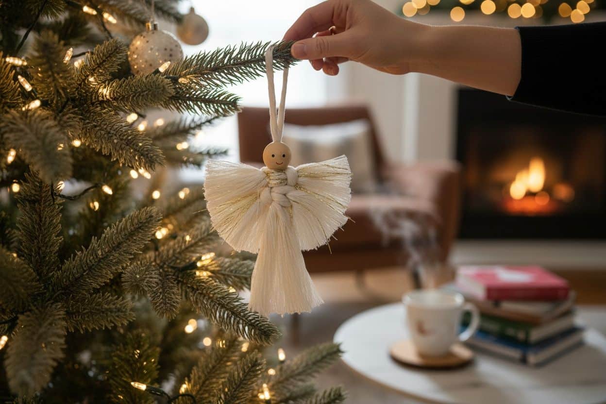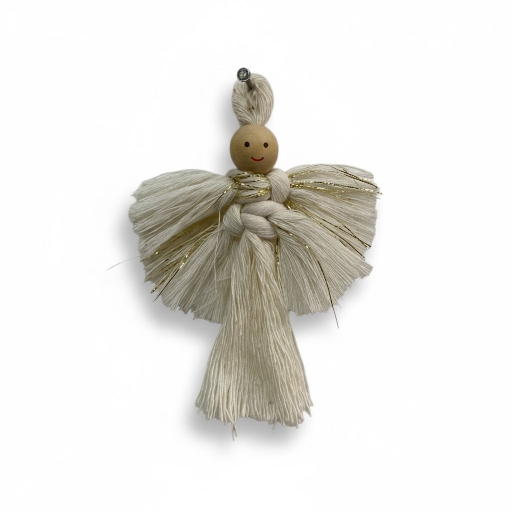 Este encantador adorno de ángel combina la calidez de lo hecho a mano con un diseño minimalista y elegante. Es la pieza perfecta para añadir un toque boho-chic y rústico a tu decoración navideña o para regalar un detalle con significado.