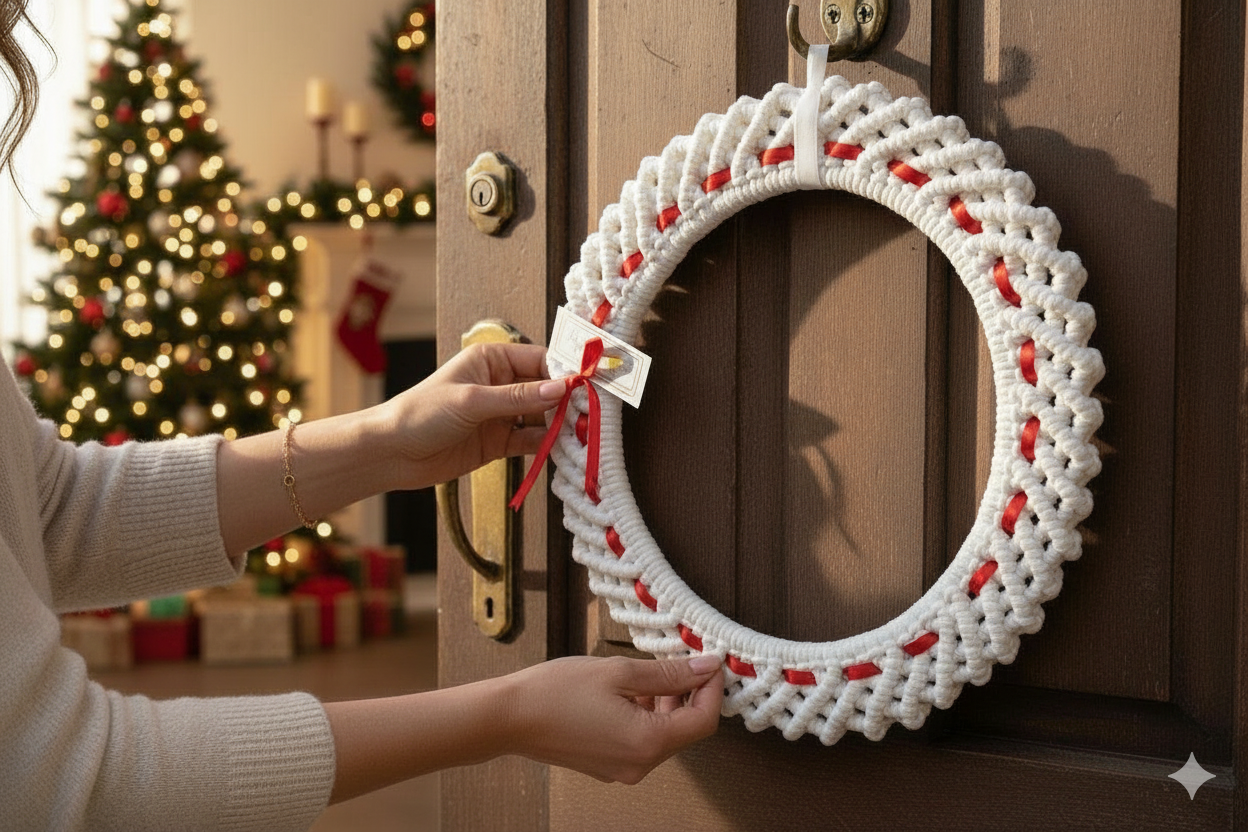 Eleva la decoración de tu hogar con esta Corona Blanca de Macramé, una pieza que captura la pureza del invierno con un diseño sofisticado y artesanal. Es el complemento ideal para quienes buscan una Navidad con estilo boho-minimalista y toques de elegancia clásica.