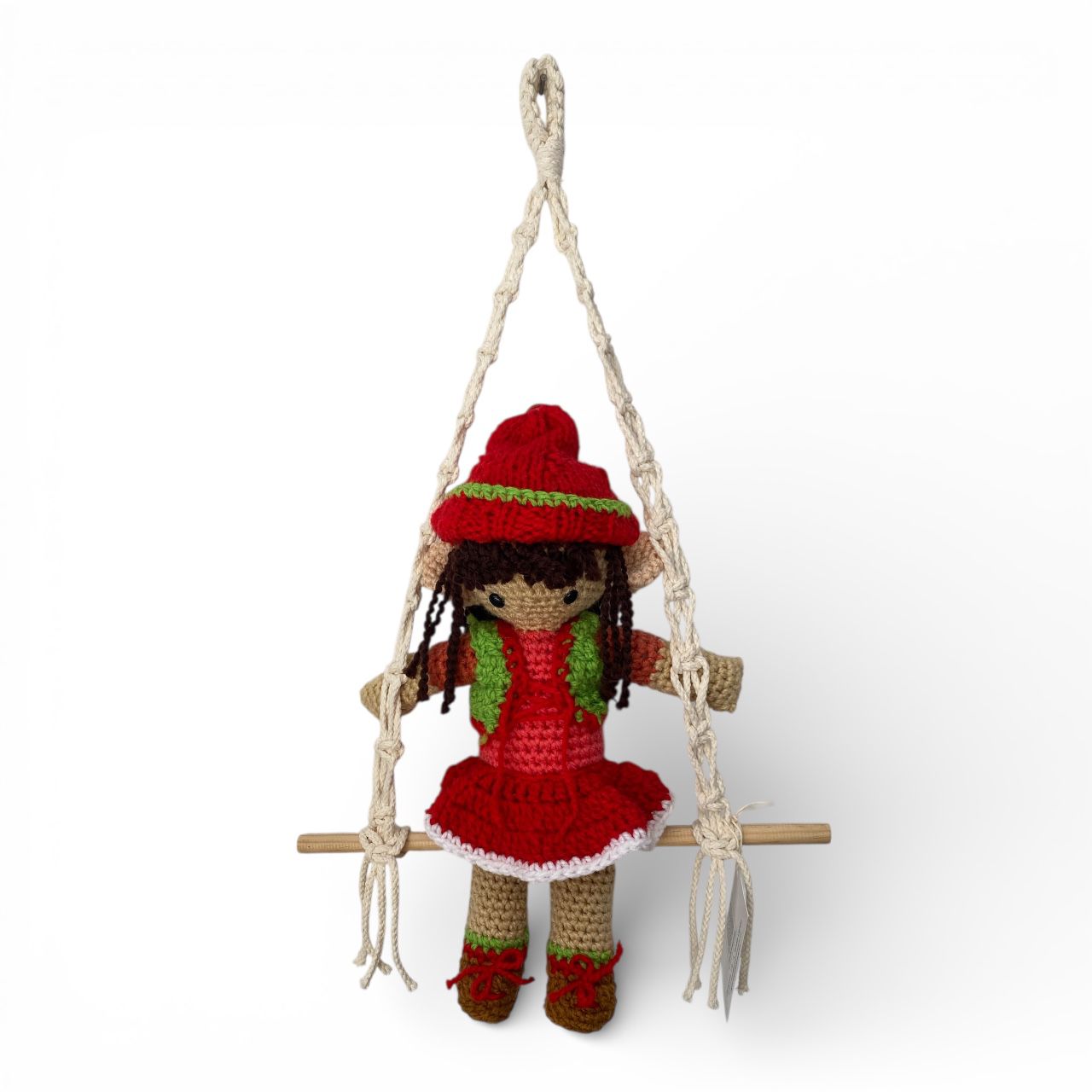 Piernas Flexibles: Sus largas piernas de hilo permiten que cuelguen con gracia desde el columpio, dándole un aspecto ligero y juguetón que encanta a niños y adultos por igual.
