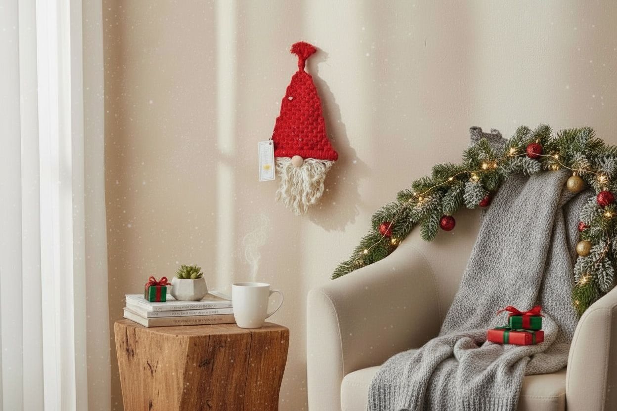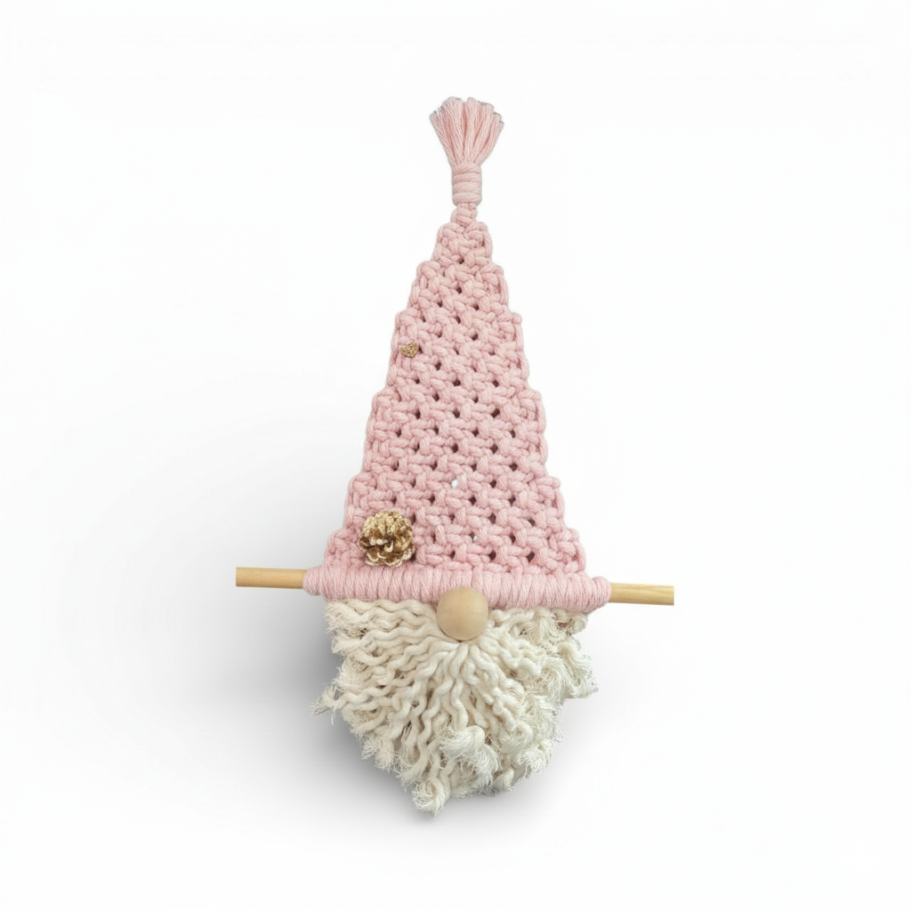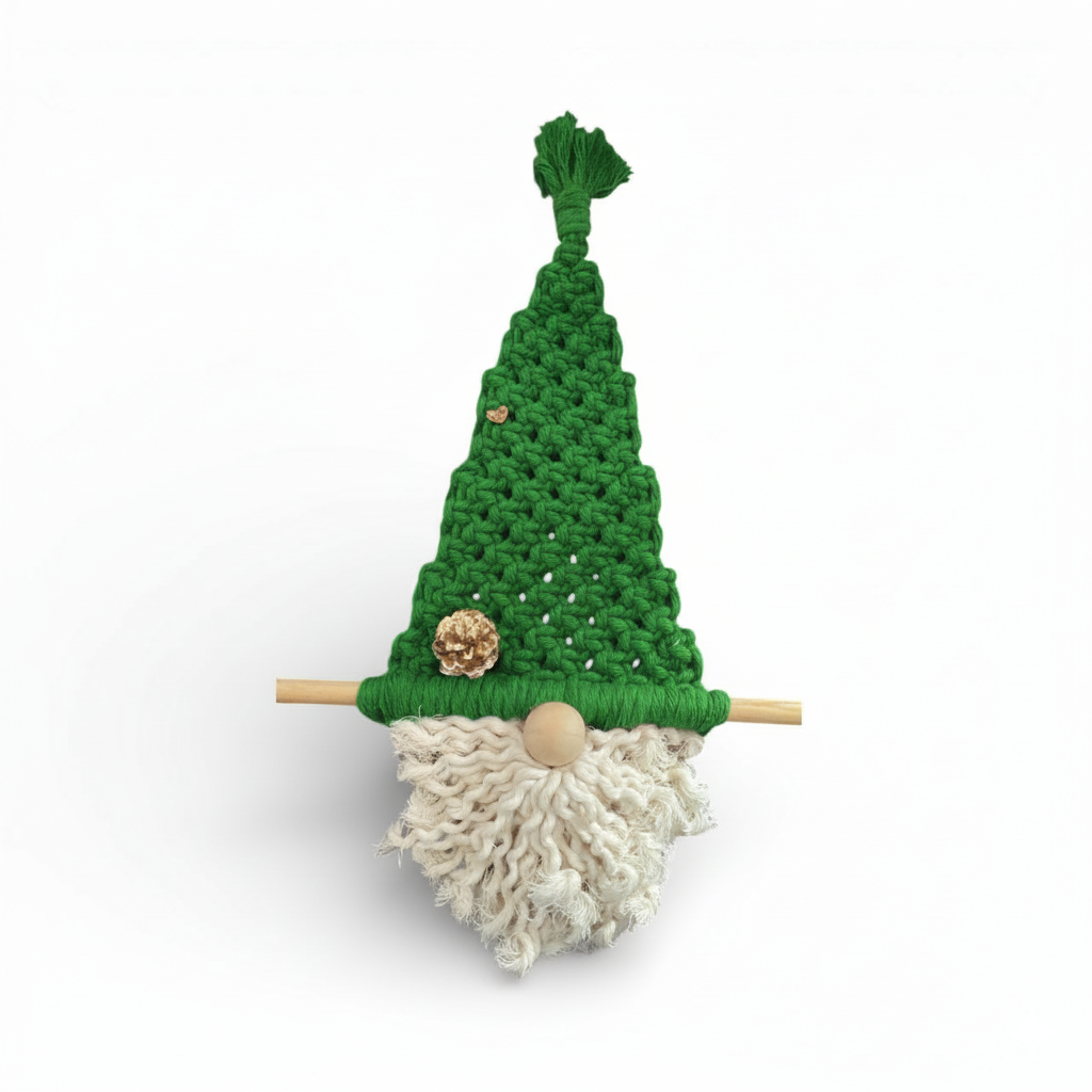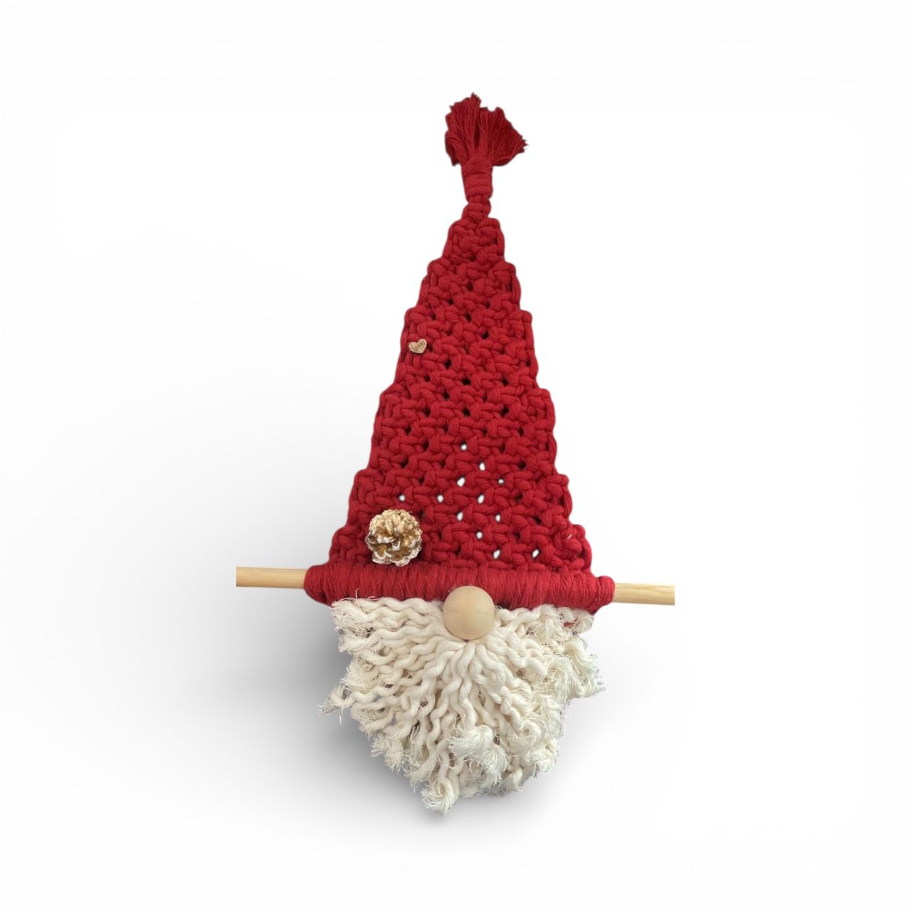 Texturas Artesanales: Cada Santa cuenta con un gorro tejido en nudos de macramé de alta precisión y una barba tupida deshilachada en tono crema que aporta volumen y suavidad visual.