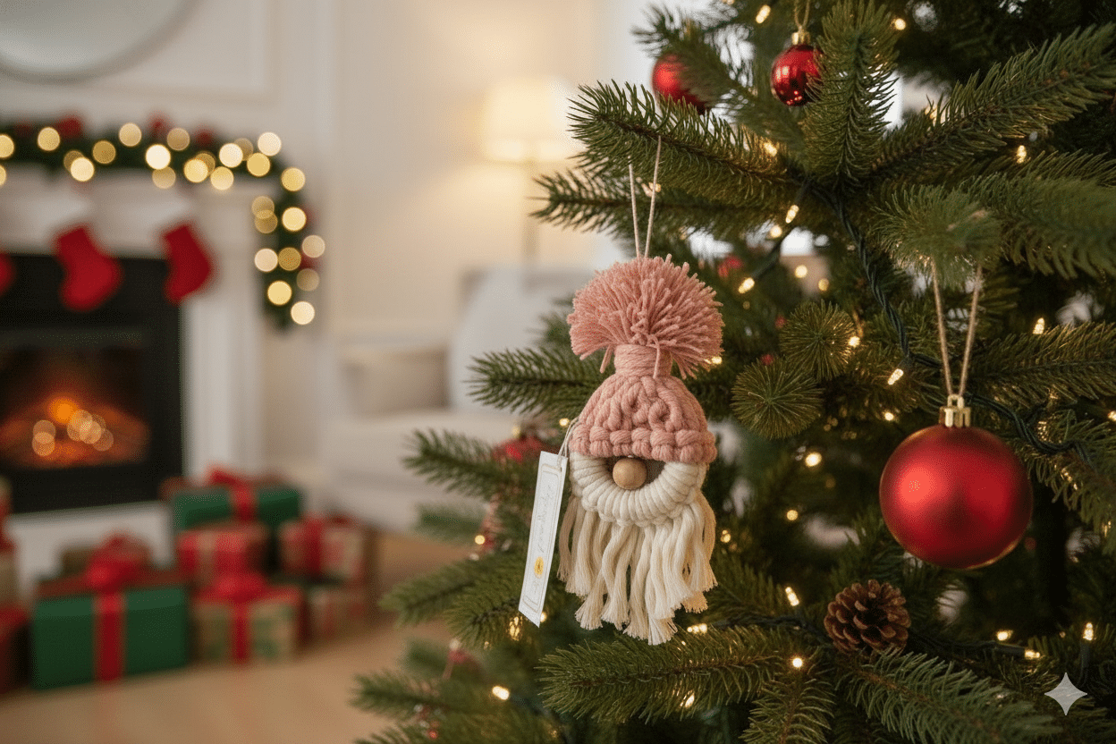 Icónico Rosa Navideño: El gorro tejido en un rosa claro simboliza la alegría de la temporada, haciendo que resalte de inmediato entre las ramas verdes de tu árbol.